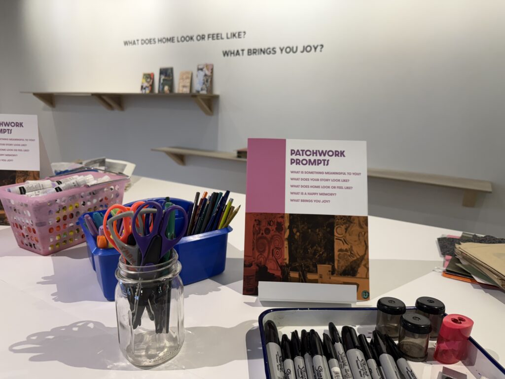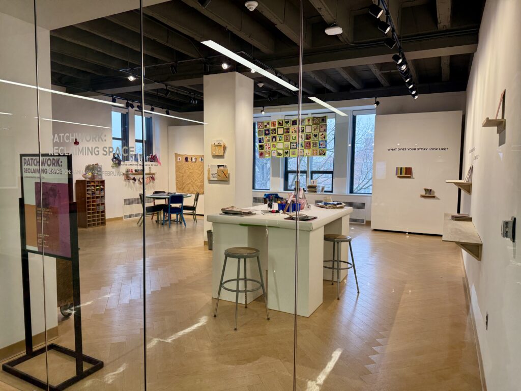 Patchwork: Reclaiming Space is an open invitation to pause, make, and remember. Here, book covers become personal narratives, shaped from scraps of paper, marks of color, fragments of memory. Add your story to the shelves. Work alongside others at the communal table or settle into a quiet nook by the windows. Assemble or stitch a fabric patch and add it to the evolving upcycled tapestry. Drop in between classes, continue a collage, begin a new one, or contribute another patch.